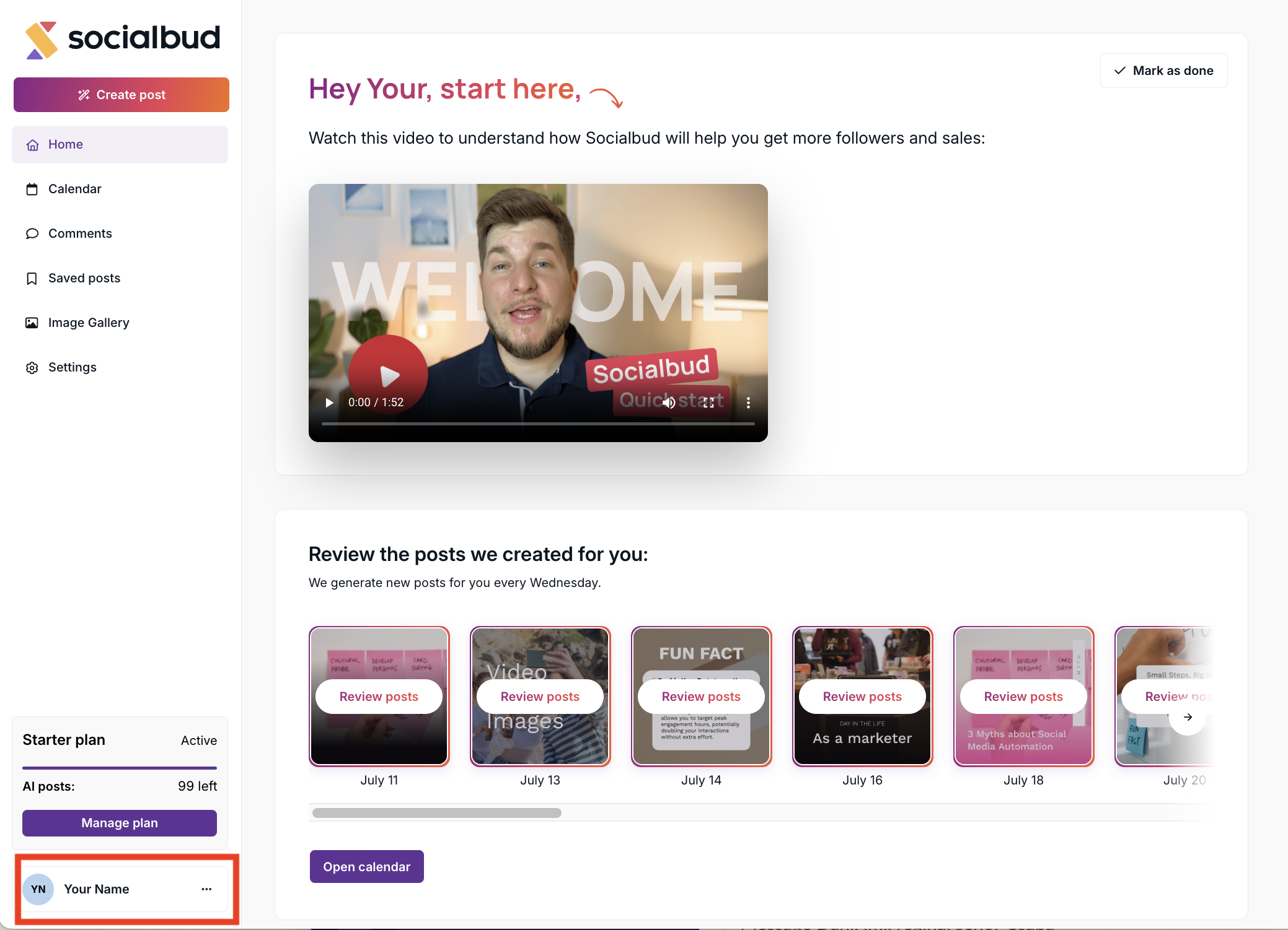 The Socialbud platform provides easy access to your account settings, allowing you to manage your profile, subscription, and preferences conveniently.